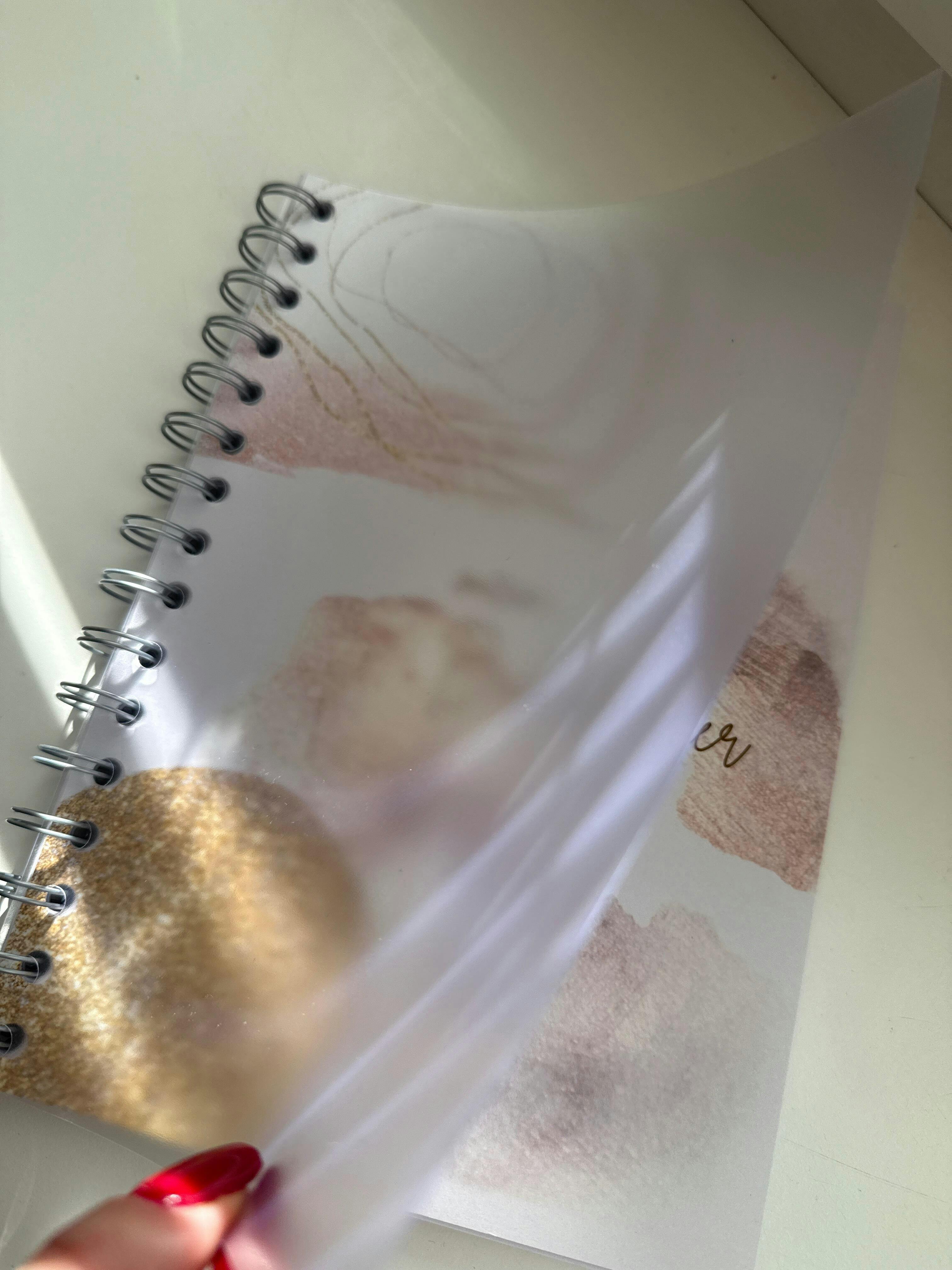 Variante Ringbuch DIN A5, Schutzcover Vorder- und Rückseite, Papprückwand, 80 Seiten in 120g Papier.