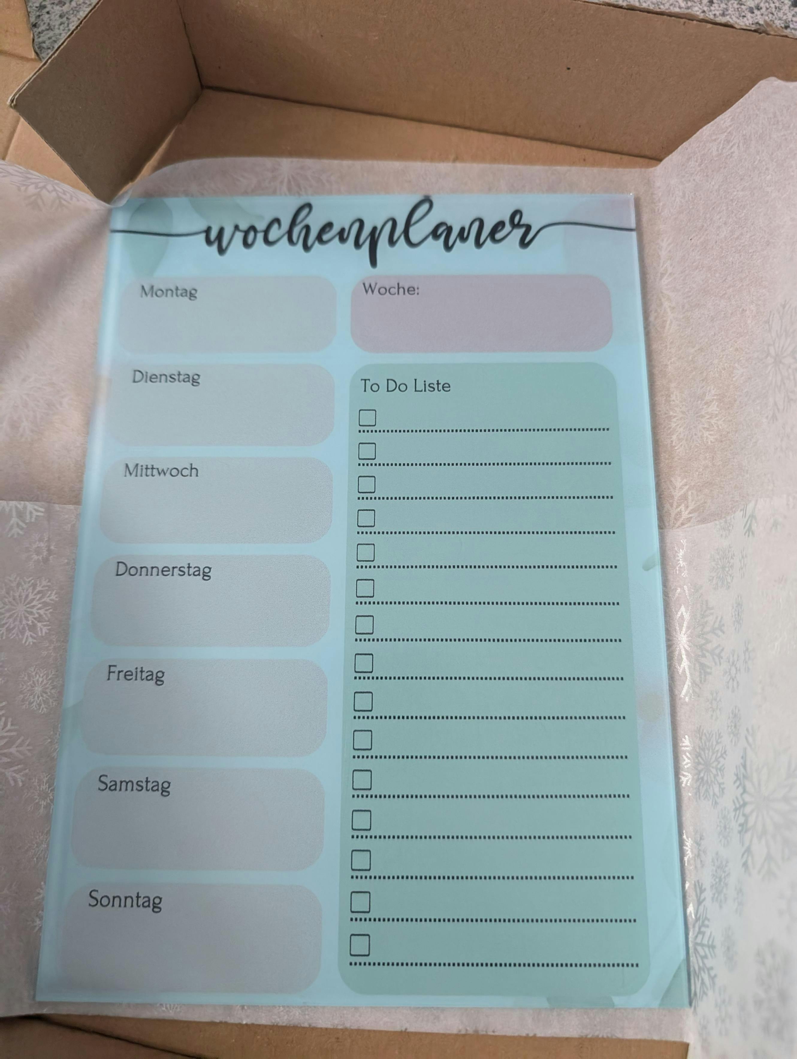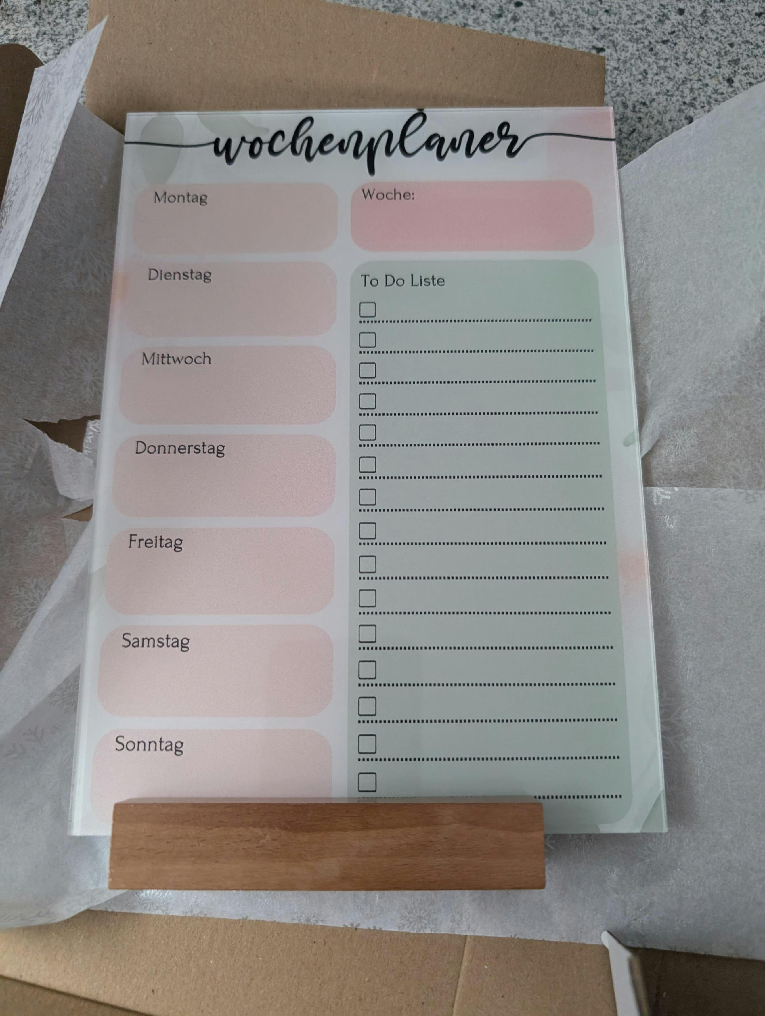 Plane deine gesamte Woche mit dem wieder beschreibbaren Wochenplaner auf Acrylglas. Nutze einen wasserlöslichen Folienstift und wische deine Planung einfach mit Wasser weg, wenn du sie nicht mehr brauchst.